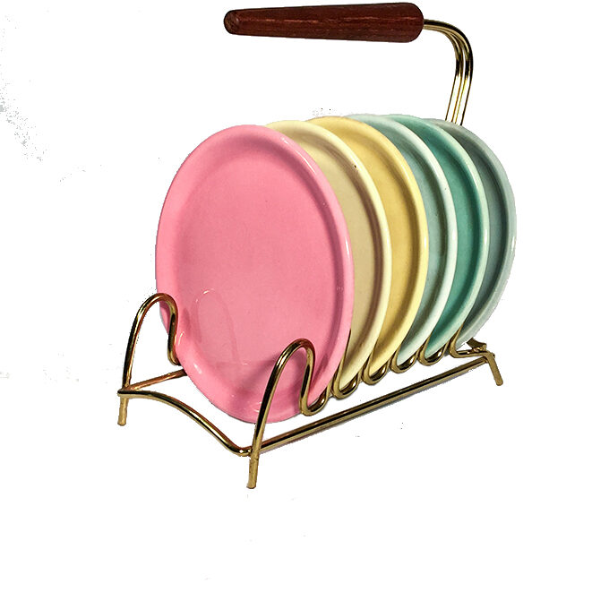 Startseite | Produkte | Ausverkaft | 6 Tellerchen, mit Halter, für Brunch, 50er Jahre, farbig