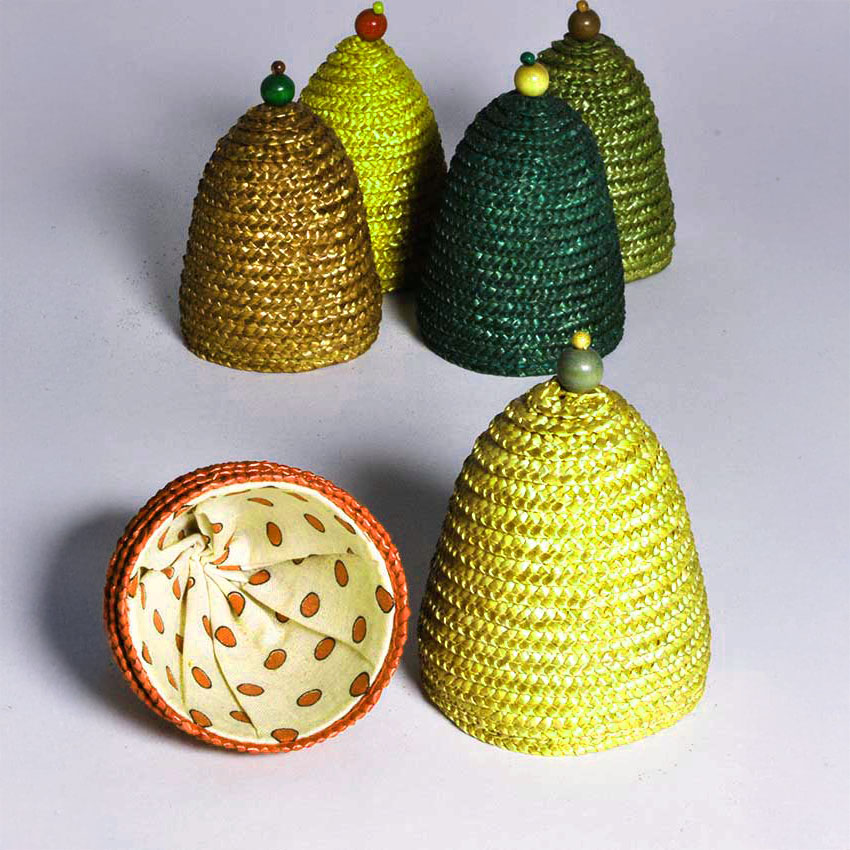 Startseite | Produkte | Ausverkaft | 6 Eierwärmer, mehrfarbiges, geflochtenes Stroh, gefüttert, 60er-Jahre