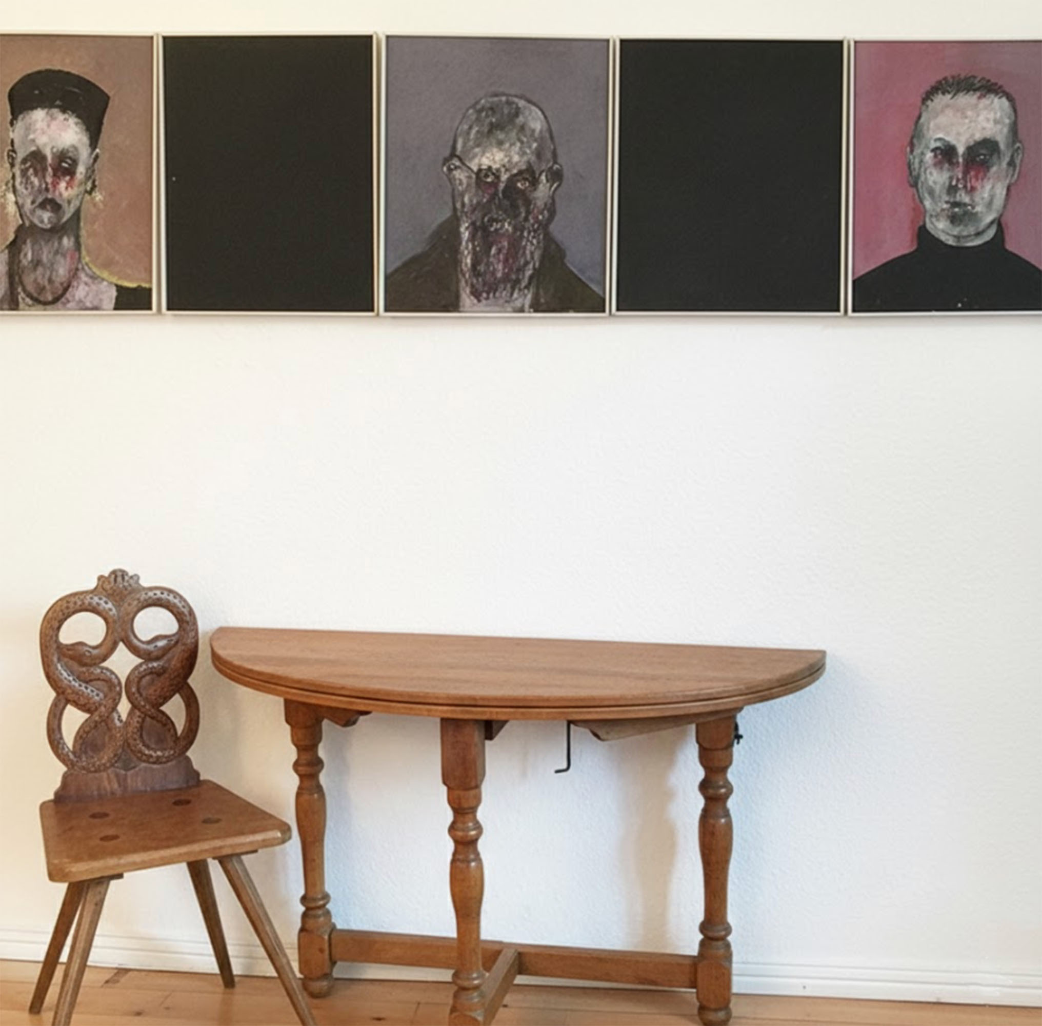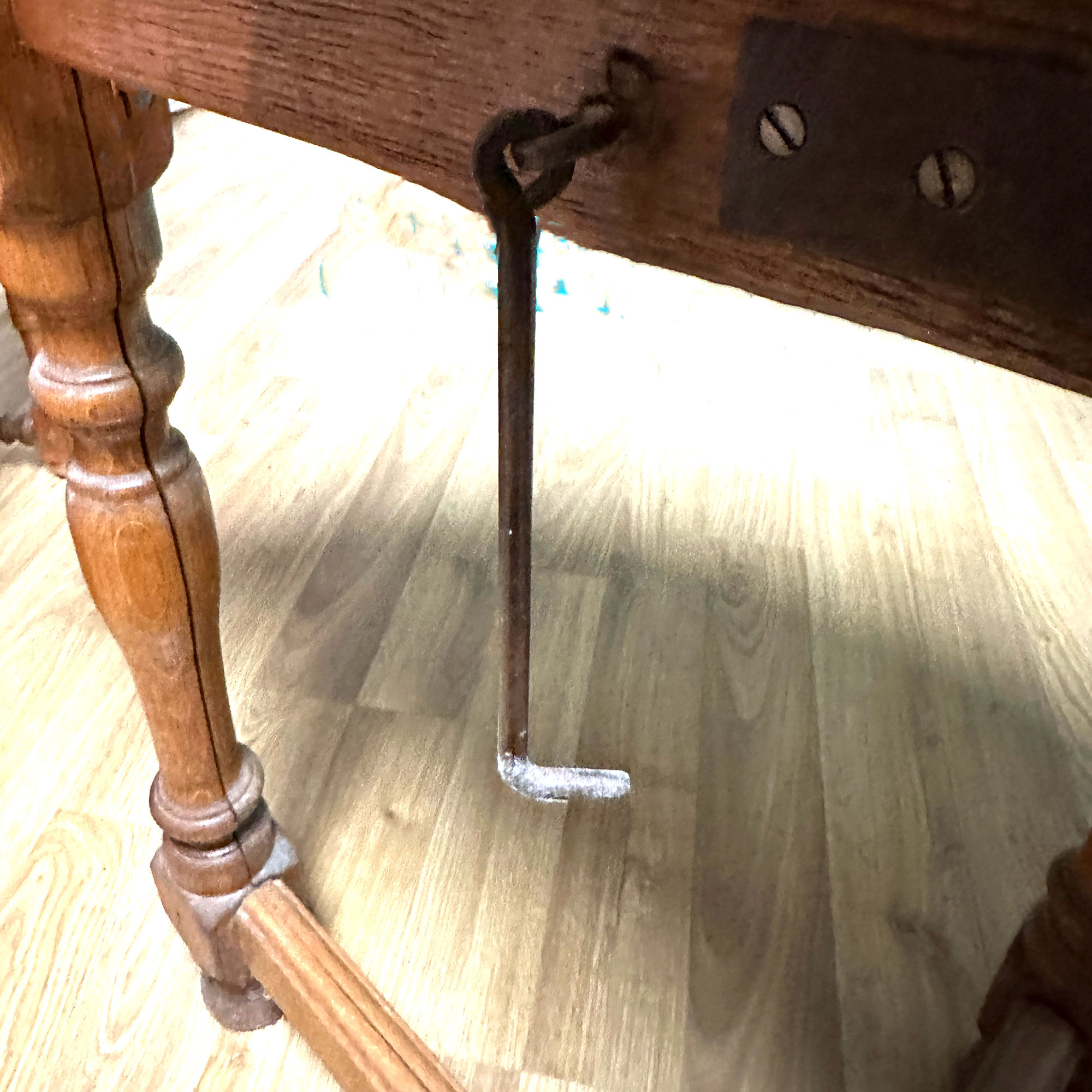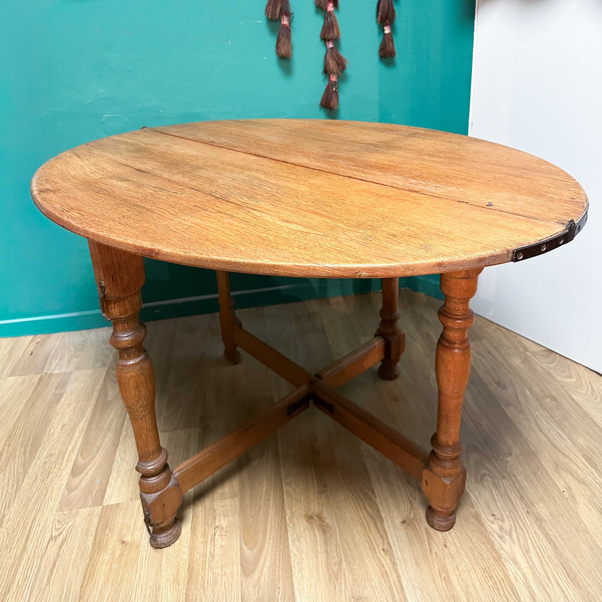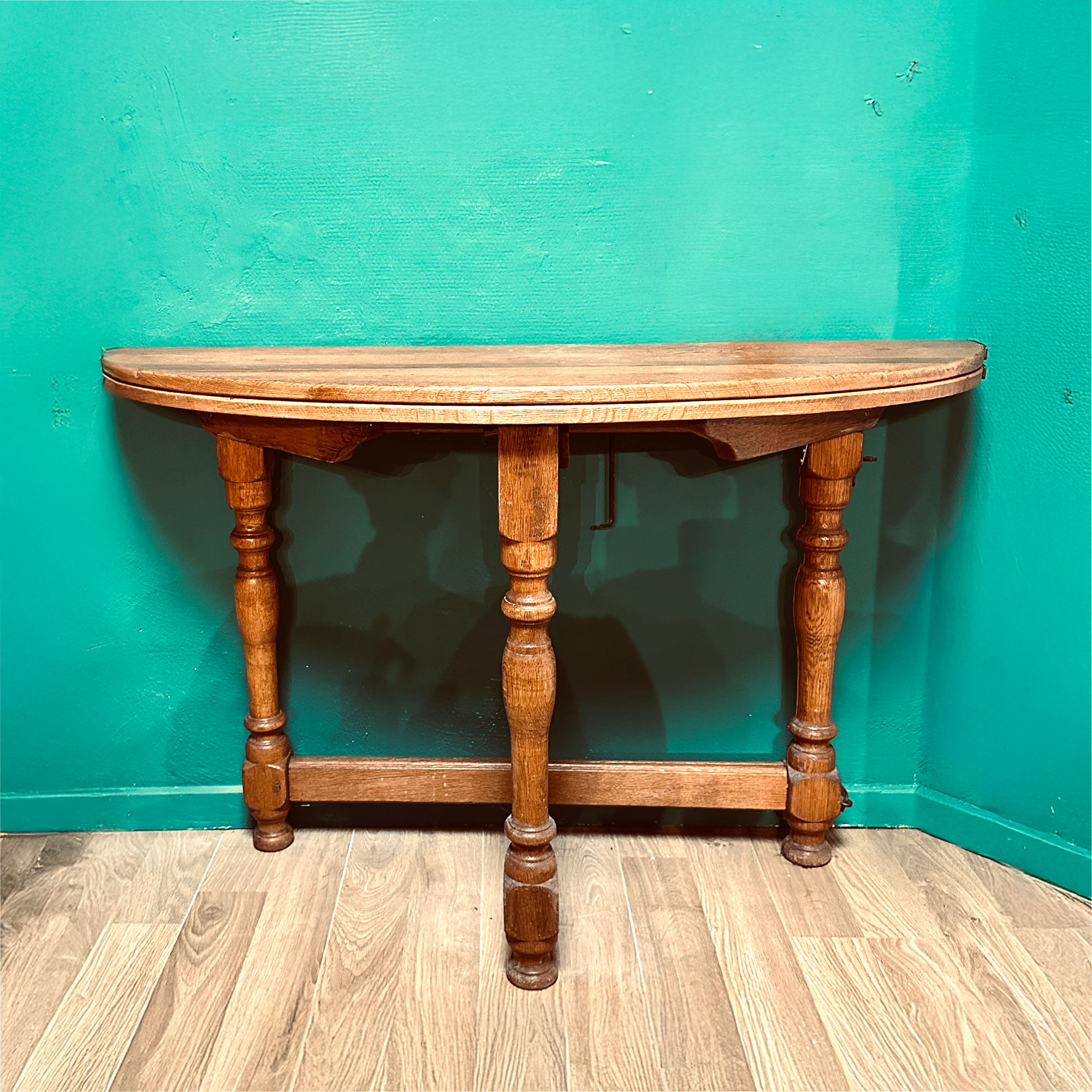 Der antike Klapptisch Demi Lune wird mit wenigen Handgriffen zum ovalen Esstsisch. Er ist aus massiver Eiche (ca. 1860) und ein Platzwunder: Zusammengeklappt formt er einen halbrunden Wandtisch (Demi-Lune), aufgeklappt wird er zum ovalen Esstisch für 4 Personen. Handgeschmiedete Beschläge – klares Zeichen der Entstehung vor der Industrialisierung. Die gewachste, helle Eiche zeigt die natürliche Maserung.