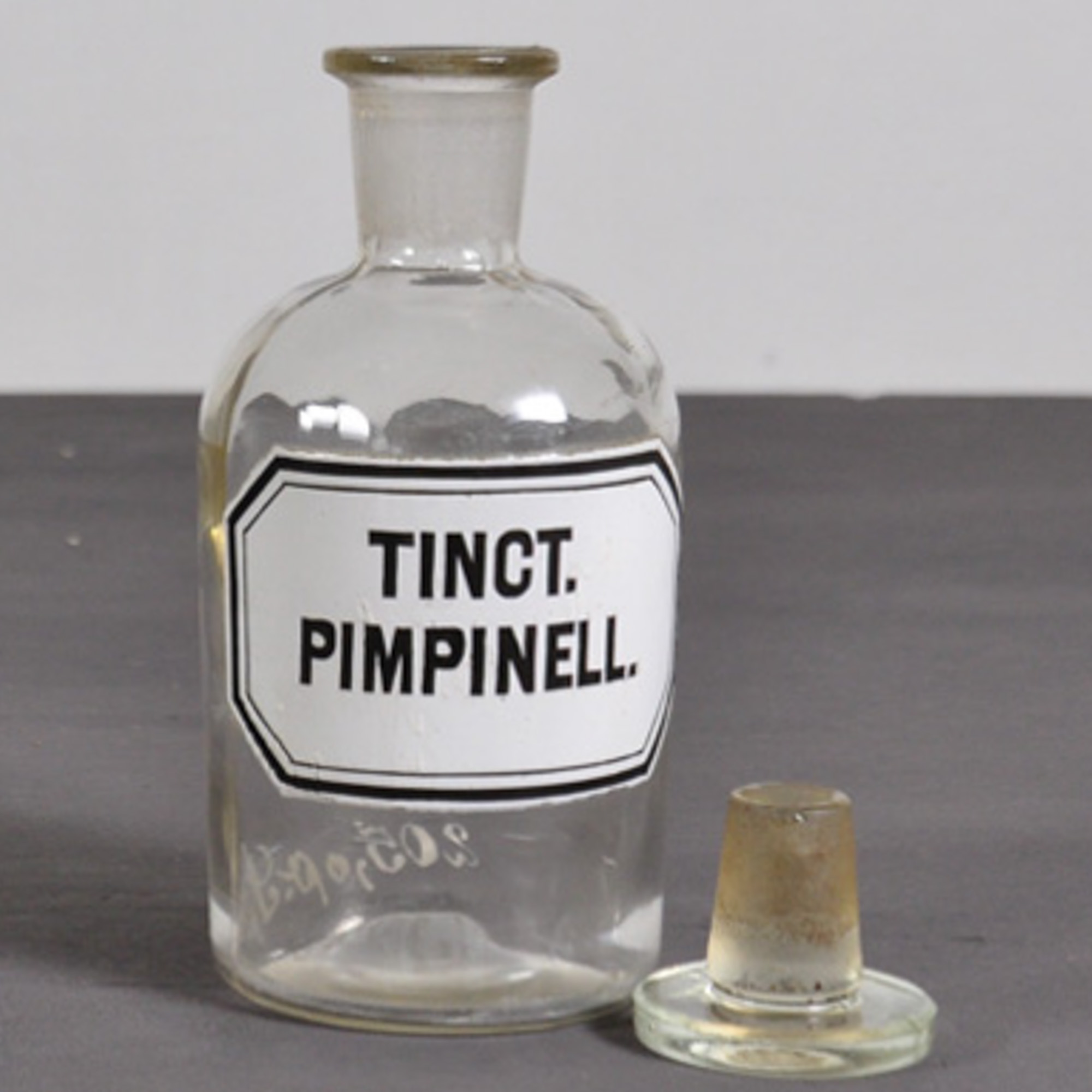 Glasgefäß aus Apotheke, Labor oder Arztpraxis, mit eingeschliffenem Glasstöpsel. Mit Emaillefarbe wasserfest mit TINCT. PIMPINELL etikettiert.